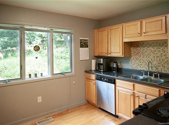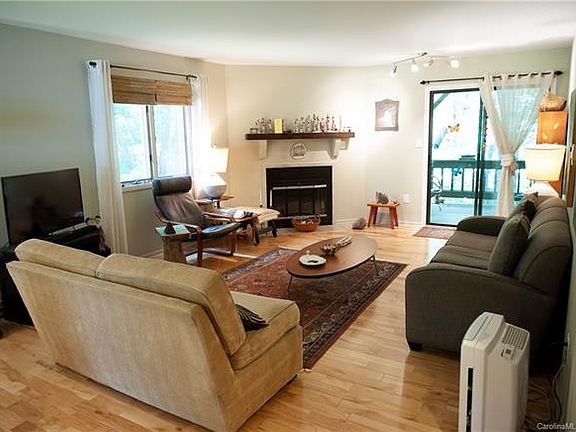 Affordable (under tax value) well maintained condo just outside city limits. 3 min from Blue Ridge Parkway and 10 min to dowtown AVL. End unit main level in quiet complex. Ceiling has two layers of drywall for added noise insulation. Natural wooded setting with babbling brook off private back deck. Semi-open floor plan. Open breakfast bar separates kitchen from connected dining and living areas. Beautiful stainless appliances. Wood floors throughout. Homey wood fireplace for cool evenings. Handy outdoor closet. Split bedroom layout for privacy. Master has giant walk in closet and laundry is conveniently located in hallway between bedrooms. You can afford a great Asheville home in a lovely location with recreational amenities all a well-maintained home with storage, and living space to spare. Sellers are motivated. Bring all offers. Fun fact: Seller can name twenty different bird species that eat from the feeders.