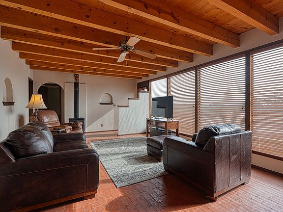 Nestled in the sought-after El Dorado area of Santa Fe, this stunning two-bedroom home offers the perfect blend of southwestern charm and modern efficiency. Thoughtfully designed with passive solar, this residence captures natural warmth, creating an inviting ambiance year-round. Inside, the classic Viga ceilings and Saltillo tile add timeless character, enhancing the open and airy layout. Outside, enjoy nearly two acres of beautiful land, perfect for those seeking privacy and breathtaking views of Santa Fe’s iconic landscape. This home offers serene, spacious living just minutes from the cultural heart of Santa Fe.