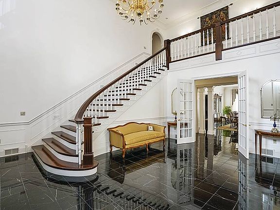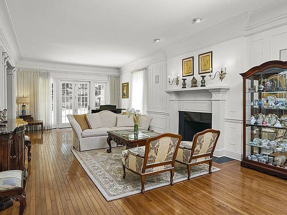 A truly Grand Colonial with two double story entrances features a wonderfully planned layout for easy living, informal and formal entertaining. The chef's kitchen with center island, butler's pantry and large breakfast area anchors family activity while the formal living and dining rooms are spectacular with access to the terrace and stone walled gardens. A fireplace in step-down gathering room links to the sun room and two decks-perfect for summer evening get-togethers. The master suite is a romantic hide away with his and her baths, his and her closets, dressing room and fireplace in bedroom with French doors leading to a balcony overlooking the gardens. Three family bedrooms are all en-suite while a two-bedroom, one bath guest suite is perfectly secluded. A fireplace in sitting room is ideal for winter evenings as the snow falls. An elevator provides access to all levels including the lower level that adds an office, family room, billiards room, bar, kitchen, wine cellar, sauna and bath.