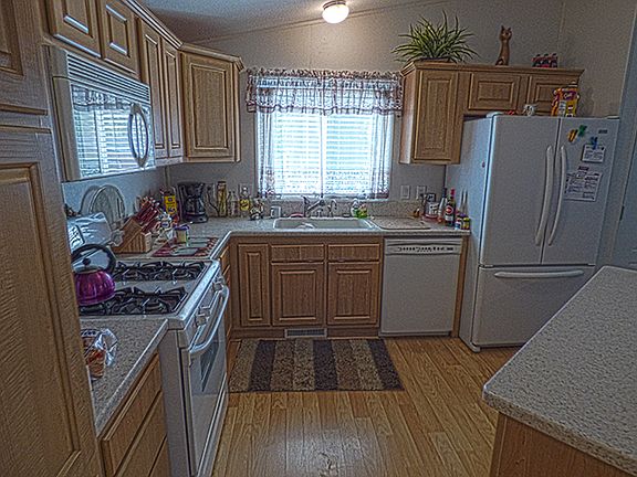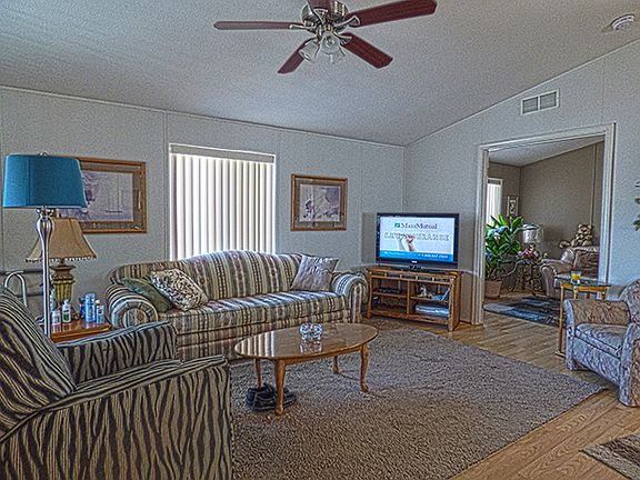 Nice home in great park! Unique 2 bedroom 2 bath home in desirable park. Vaulted ceilings and ceiling fans throughout. The kitchen is good size and open to the dining room and living room. Great for entertaining! All major appliances are included. The home has central AC. This home has lots of natural light and is a great option for anyone. Both bedrooms are good sized and the separate laundry room comes with a washer and dryer. Fenced back yard, nice front porch, carport, and storage shed. Lot Rent: $656/mo | Includes: None