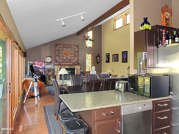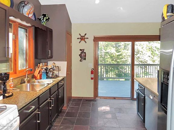 A Northwoods feel in The Galena Territory! Situated at the end of a cul-de-sac and tucked back in the trees at the end of a long private drive sits this rustic contemporary retreat with stunning focused view of Lake Galena. Open main level features large kitchen with granite counters and natural slate tile flooring, separate dining area beyond, living room with vaulted ceiling and fireplace, spacious master bedroom, nicely appointed full bath, and guest bedroom. Finished walk-out lower level offers huge family room great for recreation or relaxation, generous guest bedroom, large bonus room great for den/office, beautiful full bath with farm-sink vanity top and tile floors, laundry/utility room, and under stair case storage. Outdoor areas include lots of yard space and expansive rear deck, the perfect place to take in surrounding nature and enjoy the sights and sounds of the lake. Detached two car garage with room for storage. Sold with some furniture included in asking price and to be negotiated separate bill of sale. Seller offering one year home warranty plan at closing.