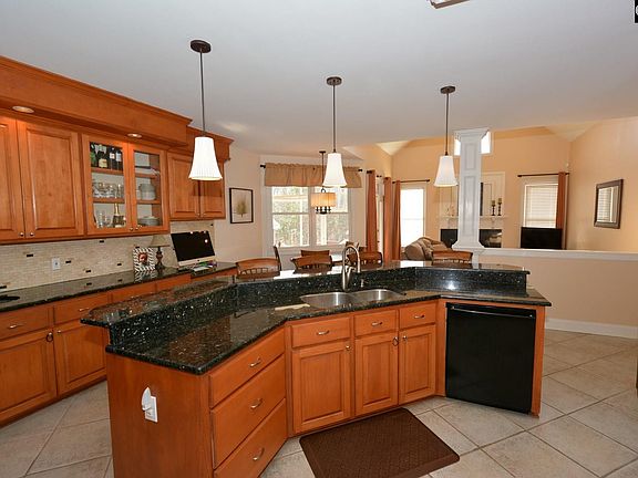 - Kitchen: Bar, Counter Tops-Granite, Eat In, Pantry, Island, Floors-Tile, Cabinets-Stained, Backsplash-Tiled, Wetbar
