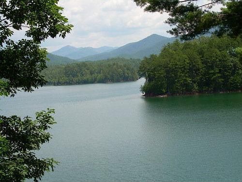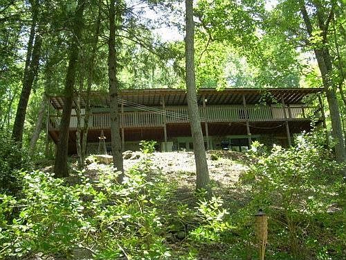 Lakefront lot with panoramic lake and mountain views, charming stacked stone cabin with fireplace, separate bunkhouse for guests at the water's edge, floating dock with covered boat slip.