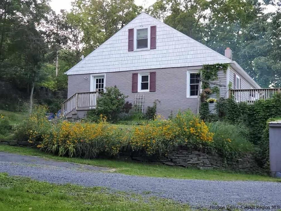 AMAZING HUDSON RIVER VIEWS. this classic cape has so much potential.. it can serve as a primary residence or summer home .Or build your dream home on the 2.5 plus lot that is at once in the welcoming community of Malden-on- Hudson - and less than a 5 minute drive to the village of Saugerties. -but also offers privacy, nature(wild turkey, deer, fox etc.), and serene blissful views of the Hudson River. Re--center as you watch the barges slowly make their way up and down the river. Amtrak passes by silently on the opposite shore like a model train and bald eagles soar majestically over head. Ground floor: large kitchen/dining space open to living area, flowing through double French- doors to a huge 24X34 deck for river viewing. Generous mud room with washer and dryer, bedroom with river views connected to a full bath. Upper level; Large Bedroom plus a bonus loft space overlooking the living area. 1632 square feet total living space with another extra 900 square feet beneath the house and above ground which presently serves as a double garage and workshop. Municipal water and sewer . 2200 BTW Ductless heat and air system installed in 2019, as well as backup oil baseboard heat, and new hot water heater. Grounds include a 200 plus foot , hand curt bluestone wall that is estimated to be 100 years old. which need TLC All trees and shrubs in front of the river view are part of the property , and be cut or trimmed , or left wild. chimney and bluestone foundation is also part of the property