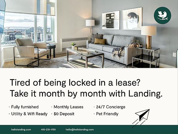 You've tried living somewhere, now try living Everywhere. See the most up-to-date pricing and availability, take a virtual tour of any apartment and make reservations without fuss through the Landing website or the Landing app. Landing's apartments are designed for comfortable and easy living, and you have the flexibility to stay as long as you like after a minimum of 30 days. There's no long-term lease required, no security deposit or application fee, and you don't have the hassle of dealing with furniture. Every apartment is beautifully furnished and fully equipped with everything you need, including: custom furnishings, deluxe kitchen appliances and gourmet coffee maker, luxury bed linens and towels, and super-fast internet for your work-from-home needs. Landing's buildings also offer an array of premium amenities. And with a Landing membership, you're getting more than a sweet apartment. You're getting an upgraded lifestyle. With 24/7 support, accessible through the app, it's easy to schedule cleanings, repairs and other services. The flexibility of stay-as-long-as-you-like living means you can take it month by month, indefinitely, switch things up every season or start exploring a brand-new city in Landing's network across the country (20 cities and counting). Seamlessly transfer to another Landing apartment with just 30 days' notice. (Nitty-gritty details: bundled utility package based on location; background check and proof of income necessary; smoke-free.) Note: This is a general listing for every available apartment in your city. Please contact us for more details. Price varies according to the length of stay.