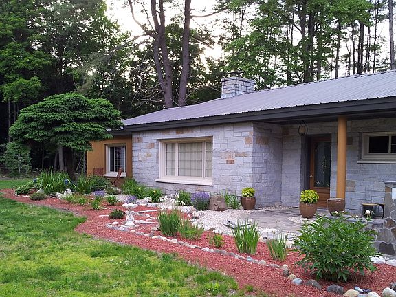 Just a short walk from the charming village of Saxtons River is this wonderful mid-century contemporary with granite and stucco accenting. The land is nicely landscaped with perennial gardens, hybrid Rhododendrons & Azaleas, large lawn area, woodland and a touch of frontage on The Saxtons River. The interior is exceptional and has been lovingly renovated. Includes stunning gourmet Kitchen, Master with en-suite bath, huge Living Room with maple flooring and granite fireplace, 3-season porch with stone fireplace and ceiling fans, attached 2-car garage with workshop, solar panels and SO much more. A fine offering!!