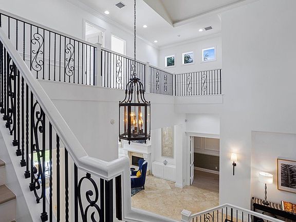 Exuding elan and elegance, this updated European-inspired Mediterranean-style gem, with five bedrooms and 7,462 +/- total square feet, features many designer details that include soaring 12-foot-high ceilings, wood and Saturnia marble flooring, and fine-crafted trim-work. A beautiful welcoming sequence is achieved at the entry, where double wood doors open to the elegant two-story reception room, with a wrought-iron embellished stairway, which flows out to the formal living and dining rooms. A highlight in the living room is the elegant gas fireplace with a wood mantel and a set of floor-to-ceiling arched windows overlooking the pool, while in the dining room, French doors access the poolside loggia. The richly paneled office is finished with built-in bookcases, wood-plank floors, a coffered ceiling, and arched garden-view windows. For more informal living, the cook's-island kitchen, with a breakfast nook and eat-at bar connections to the pool-view family room for easy service, is finished with custom wood cabinetry, granite countertops, tile backsplashes, high-end appliances, a large food pantry, and butler's pantry. The primary suite is located on the first floor. Details in the bedroom include wood -plank flooring, a cove ceiling, large pool-view windows, and a French door that open to the loggia. The suite comprises two large custom-fitted walk-in closets and a spa-inspired granite-and-marble-finished bathroom with a spa tub, walk-in shower, double vanities and two water closets. Four guest bedrooms preside over the second floor, with one that can serve as a primary suite or VIP suite, with an ensuite bathroom, sitting room, and French doors that open to the pool-view balcony. Completing the layout are a laundry room, completely renovated powder room, large storage areas, and attached two-car garage with a new Tesla car charger. Other features include propane gas, Kohler generator, impact windows and doors throughout, two Carrier air conditioners, Beam central vacuum system, LED lighting, and an osmosis-system water purifier in the kitchen. New improvements include Minka Lavery exterior light fixtures, Thomas O'Brien interior lighting, designer ceiling fans, and decorator motorized solar shades.