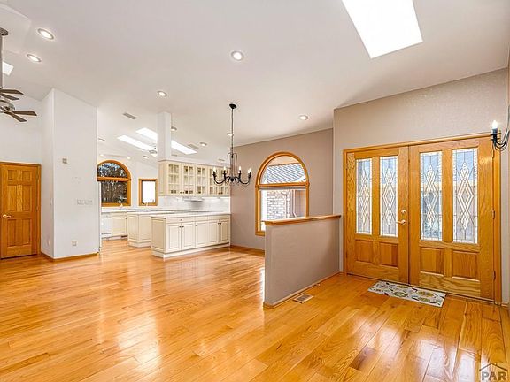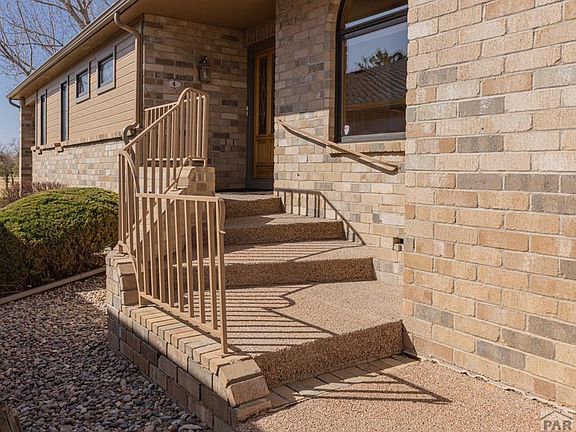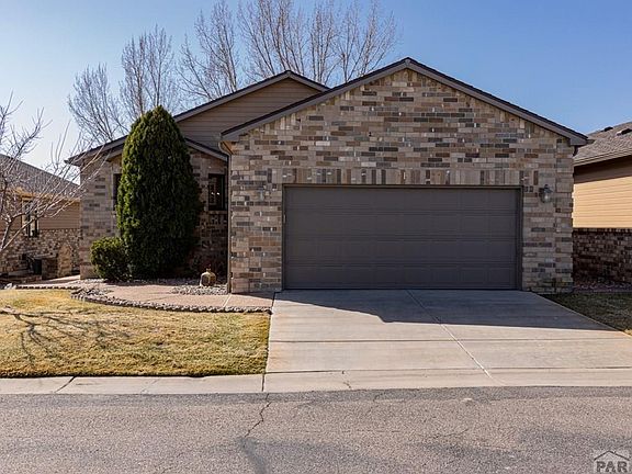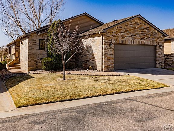 Here's your RARE chance to own one of the beautiful brick townhomes on the Pueblo Country Club golf course! Panoramic views of the greens from your large covered deck and lower level walk-out. Large living room with vaulted ceilings, gas log fireplace and view windows. Spacious Kitchen with center island, loads of bright cabinetry/lighting and wrap around countertops. Formal Dining area will fit the entire family. Primary Suite features a 5 piece Bath w/jetted tub, walk-in shower & private water closet. You'll be amazed by the floor to ceiling shelving in the main level Office Suite/Bedroom #2, and all the natural light from the many skylights on the main level. The expansive finished garden level basement features a private 3rd Bedroom with walk-in closet, a full Bath, Laundry Room w/sink, cabinets and wall mounted ironing board, and finally an impressive Storage Room (with 8x8 walk in cedar closet) for all your hobbies! Lots of extra storage space in this townhome. House has been professionally cleaned and is move in ready. Make this the one you see today!