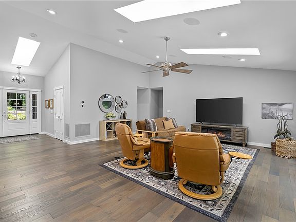 - Wet Bar, Ceiling Fan(s), Cathedral Ceiling(s), Dressing Area, Dual Sinks, Granite Counters, High Ceilings, Jetted Tub, Bath in Primary Bedroom, Main Level Primary, Pull Down Attic Stairs, Sitting Area in Primary, Solid Surface Counters, Skylights, Separate Shower, Cable TV, Walk-In Closet(s), Walk-In Shower, Wired for Sound, Window Treatments, Breakfast Area