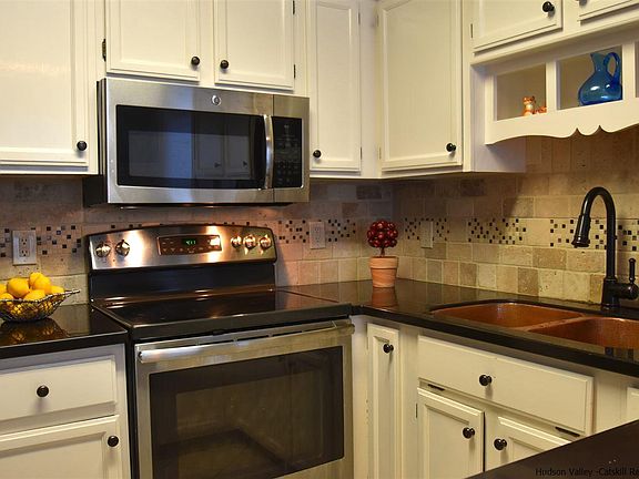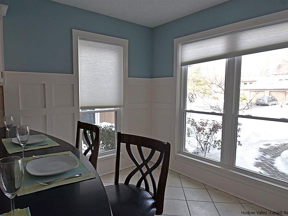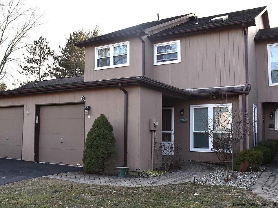 Lovely unit looking out to meadows and treeline is located in the rear of The Woods on a quiet cul de sac. Entry foyer opens to eat in kitchen that features stylish panel cabinetry and a hammered copper farm sink. To the rear is a light-filled living room with western light that features the same handsome woodworking and a woodburning fireplace. The living room is open to the dining room with its access to a private rear deck to take in the views. The first floor also features a half bath. The second floor has a master with floor to ceiling windows and a bath with tub and shower. There is an additional bedroom en suite, den with balcony to enjoy the views and laundry facilities. The unit has a one-car attached garage with room for storage. The Woods has been a Rhinebeck location for years offering community, a clubhouse, pool and tennis court. And it is walking distance to the Village's shopping, dining and movie theater. Just minutes to Amtrak it is also convenient to Bard's Fisher Center and Kingston.