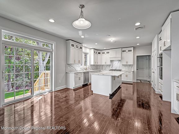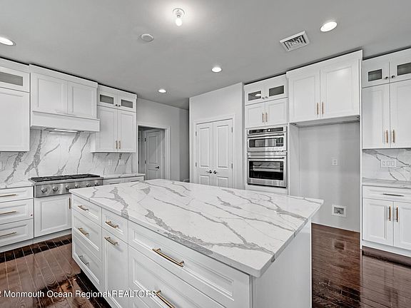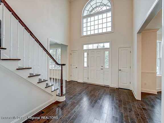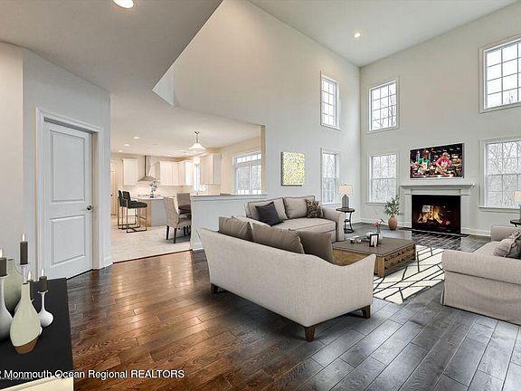 Step into a realm of elegant living with this new construction in Marlboro Township. This distinguished residence is tastefully designed with Stone & Board/Batten Farmhouse siding, radiating timeless appeal. The 1st level welcomes you with 9ft ceilings, leading to a grand 2-story family room with a gas fireplace. A gourmet center-island kitchen awaits, featuring 42'' cabinetry, modern stainless steel appliances, and shimmering quartz countertops. The layout offers a convenient 5th bedroom on the 1st level with a full bath. Hardwood flooring extends throughout the 1st level, continuing along the 2nd-floor hall, adding a touch of warmth and elegance. The master bedroom suite is a sanctuary of its own with a coffered ceiling, a restful sitting room, and a lavish bath with a free-standing tub, frameless shower door, and quartz vanity counters. Accommodating modern lifestyles, this home includes a 3-car side-entry garage and a 2-zone high-efficiency HVAC system. This residence is yet another testament to Suncrest Builders' long-standing tradition of crafting quality homes in NJ.