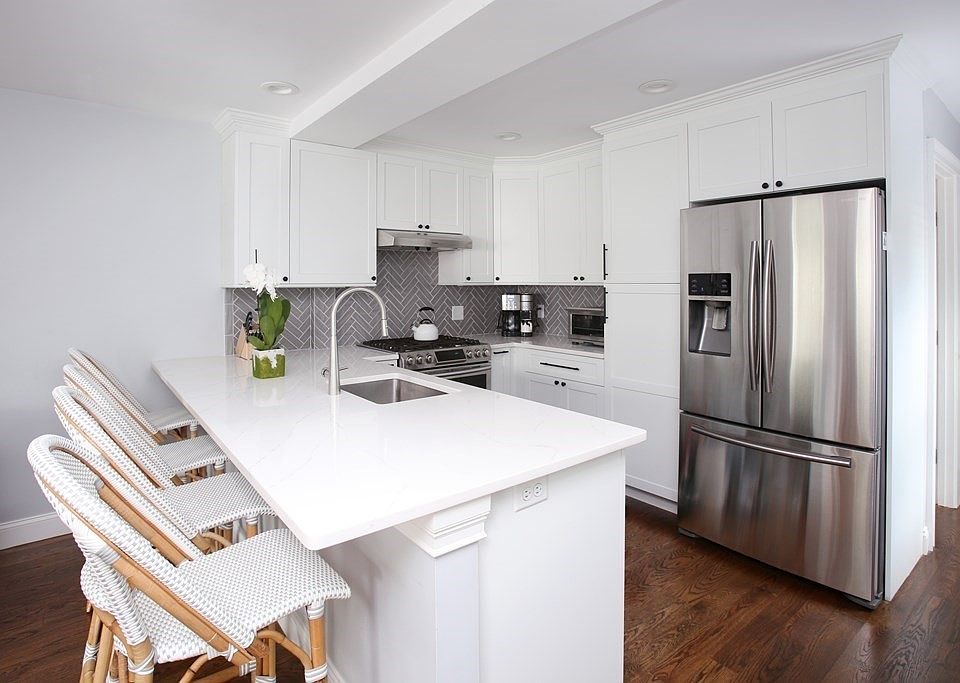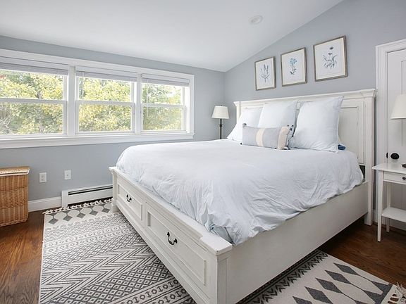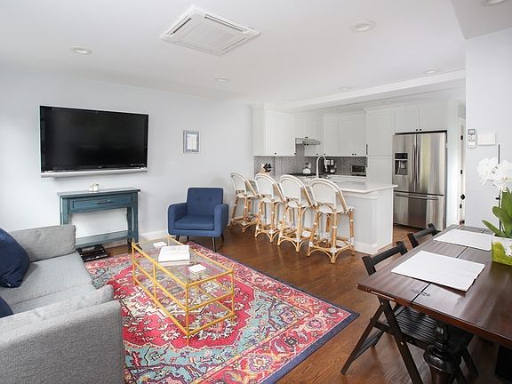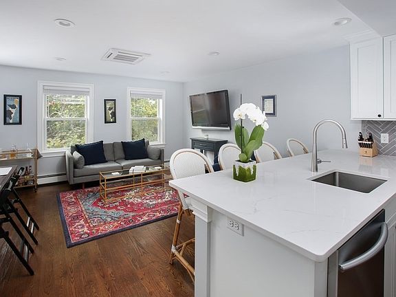 Located on a quiet private way, this gut renovated, 3 bed, 2 bath penthouse stands apart from the rest, offers high-end finishes, attention to detail & 2 private decks! Features incl. sought-after open layout, abundant natural light & hardwood flooring throughout. Ren. kitchen has white cabinetry w/grey herringbone backsplash, quartz counters, includ peninsula that seats 4 and ss. appliances. Spacious living and dining off of the kitchen. Sizable master suite w/custom closets, an ensuite bath & hardwood flooring. “Spa -like’ bath” boasts frameless glass shower w/ subway tile surround, a grey double vanity w/ marble top & tile flooring. Guest bed offers hardwoods & private deck. 2nd bath has tub/shower w/tile surround & white vanity. Interior stairs lead to serene private deck. This extremely accessible private oasis is the ideal place for entertaining or simply relaxing. Cent. air, in unit w/d & add. basement storage complete this rare to market home!