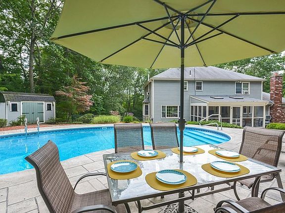 Spacious and sun filled colonial nestled amongst the trees on a private neighborhood location. The home features a beautifully landscaped yard with a heated kidney shaped pool surrounded by perennial gardens and stone walkways and patio. Inside the home has an updated eat in kitchen with Stainless Steel appliances, Corian counters and breakfast area overlooking screened porch and pool. Fireplaced family room with built in cabinets and cathedral ceiling. Large front to back living room with commanding views of yard, four large bedrooms, and many updates including roof, gutters, heating system, pool heater and new septic in 2013. The neighborhood is minutes to shopping and route 495.
