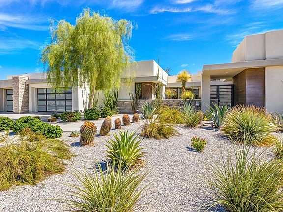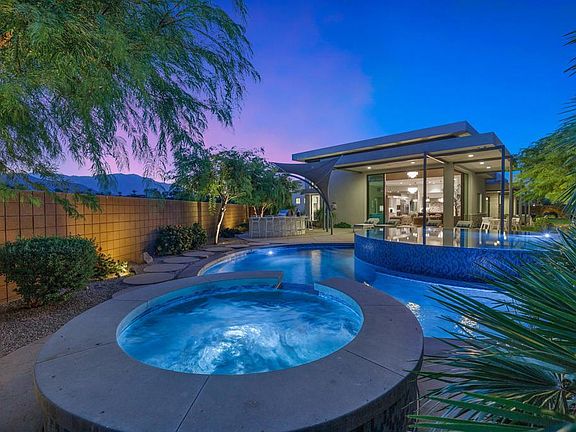 Wow! What a unique opportunity to own a furnished modern masterpiece off of the prestigious Clancy lane in Rancho Mirage. This modern estate is situated in the Revelle HOA which is the newest portion of Clancy lane, with a very low monthly HOA. South facing panoramic mountain views reflecting off of the infinity edge circle tanning deck pool. The main house features 3 bedrooms, 3.5 bathrooms plus a detached 1 bedroom, 1 bathroom guest house. It is an entertainers paradise with multiple areas to entertain with high ceilings, high end audio visual surround system, owned solar, closed circuit surveillance security system, custom finishes throughout and each room having a wow factor. The kitchen features a custom waterfall edge center island, top of the line Wolf and Sub Zero appliances. The large floor to ceiling custom stackable sliders open the living room fully up to give a true indoor outdoor zen feeling. Call today to schedule your private showing.