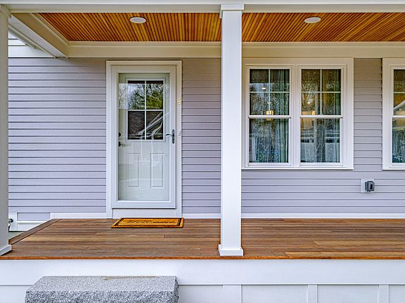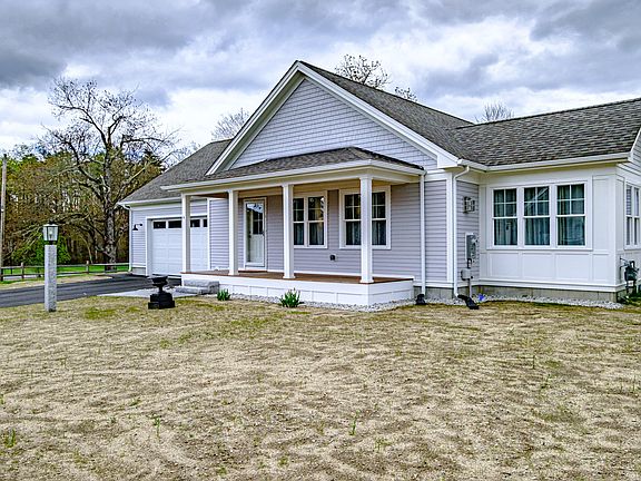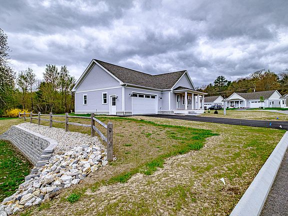 Stunning newly constructed home located in a 55+ neighborhood in the center of North Yarmouth! Fabulous layout and finishes that include an open living area with upgraded custom woodwork, high-end quartz counters and upgraded cabinets in the kitchen along with oak hardwood floors throughout. Take advantage of an end lot offering more privacy and lawn area! Enjoy a covered front porch, open living room with gas fireplace, bright sunroom and large kitchen/dining area. Great mudroom with laundry closet hosting upgraded stackable washer and dryer is the essence of convenience. It doesn't stop there this home features a spacious primary suite with beautiful tiled shower in the bath with glass door, a second bedroom and full bathroom for guests. The home also offers central air conditioning, a large 2 car garage with access to the full unfinished basement, rear patio, irrigation system and a corner lot! The single level living aspect is highly sought after and offers a convenient living concept.