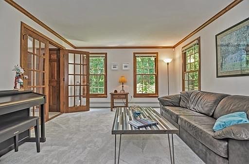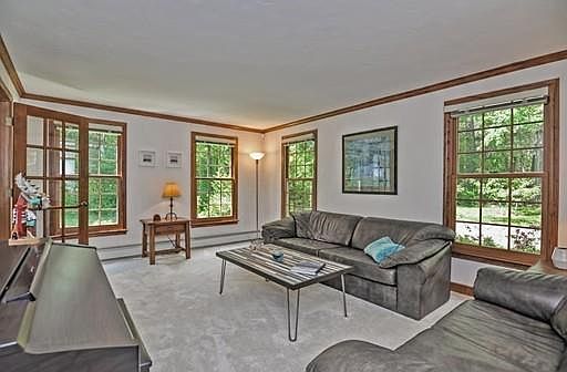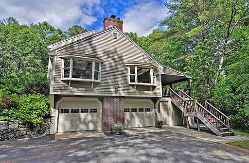 Privacy and Nature abounds! Every room is filled with natural sunlight and set on a tree lined 1.38 acres, abutting conservation land. This meticulously maintained property shows pride in its ownership. First floor features an open floor plan. The cabinet filled Kitchen has wide pine flooring that flows into the family room featuring over sized bay windows, exposed beams and a large wood burning fireplace. Triple window wall with door draws you onto the covered deck. Enjoy the 3-season porch perfect for morning coffee, mid afternoon naps or to read a book. Bedrooms are generously sized and feature custom closet systems and are located on the upper floor. New Carpet. Fitness room in basement with mud room off the garage. New fruit trees recently planted to finish off a very mature landscape, that blossoms all season long. Extra storage in shed and under the porch/deck. Come inside, stop, look and listen to all these stunning features and picture yourself in this quiet tranquility.