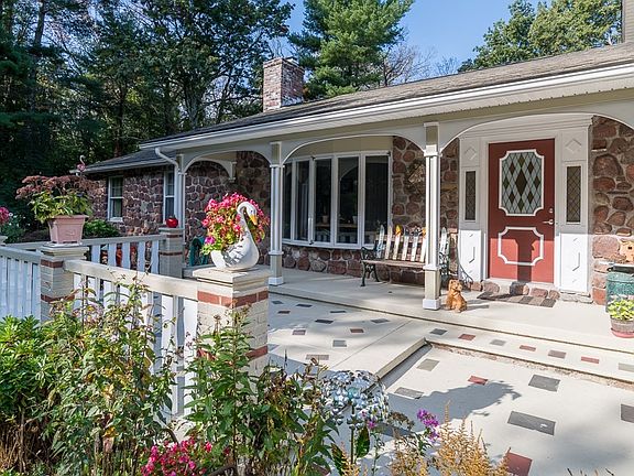 Imaginative and meticulous expanded ranch with an upstairs addition that includes 2 bedrooms, a sitting area, and bath (addition has its own septic). 3 bedrooms on the first floor, two full baths, a kitchen with light cabinetry, (new refrigerator) porcelain floor, newer granite counters and a dining area that leads to a lovely heated cathedral ceiling sunroom.(approximately 12'x 14') with a perfect view of the the lovely private back yard. The lower walk out level( not include in the square footage offers a lovely family room complete with a gas operated fireplace second kitchen, a bar and dining area decorated with a lovely hand painted lakeside mural. A delightful and soothing accessory! Next to the Cucina and dining space is an area currently used as a gallery (with electricity to allow for potential heating), an office and a closed off workroom .There's a gas line to the house for potential gas heating.Don't miss the mini water fountainin the front.