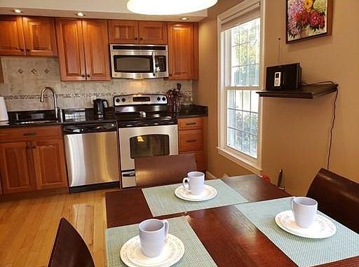 FULLY FURNISHED! available June 1st. Move right in to this upscale and pristine 2 BR - 2.5 Bath, townhome in Natick only 2 minutes to the highway and the Natick Mall. This two floor town home is full of light and space. Enjoy the warm fire placed living room with slider to the deck for easy grilling. Open floor dining room area with TV and a glass top dining room table accommodating 8. The eat- in kitchen is fully equipped with dishes, cooking pots and has plenty of cabinets, granite countertops and everything you need for your daily life including a wood dining set table for 6 people. The home offers 1 half bathroom on the first floor and 2 full bathrooms upstairs. All with granite countertops/vanities and ceramic. Hardwood floors throughout and custom blinds on all windows. One car garage with access to the interior. This is a Commuter's dream location- Easy access to Rt. 9 and Mass Pike and shopping. Applicant to provide credit report. References and proof of income required.