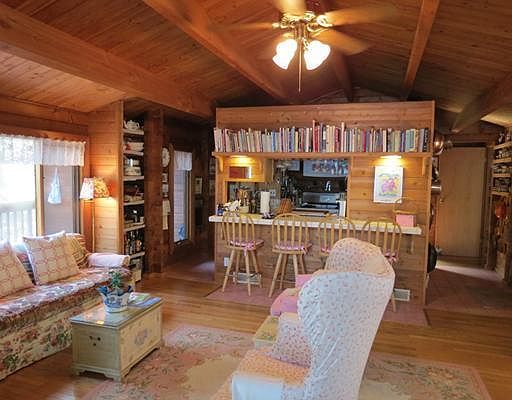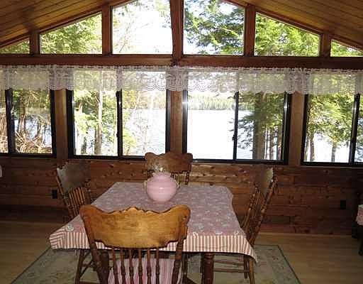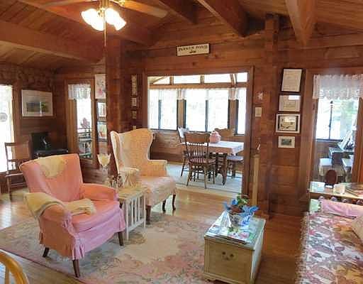 Pristine Parker Pond-Cozy 2BR Western Red Cedar Log home w/100' frontage. Yr round, lovely setting, pretty views of the water. Well maintained, open interior, exposed beams, vaulted LR, deck, full basement. Lots to offer, great value!