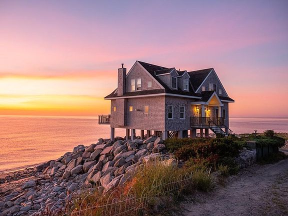 WAKE UP AND SMELL THE OCEAN! Custom designed DIRECT OCEAN FRONT contemporary Cape Cod style home on private beach with built in private steps from the patio with direct beach access and breathtaking OCEAN VIEWS on one side and picture perfect POND VIEWS on the other! This-of-a-kind home has cherry hardwood floors, cherry custom cabinets, 2 ovens, hand painted sinks in the downstairs bath and in the wet bar, built in wine cooler, huge picture windows, French doors, main floor office with built in bookshelves, imported designer chandelier, high-end finishes through-out, Brazilian hardwood deck that you can catch a fish off of. Nature's finest right at your doorstep: whales, seals, blue herons, snowy owls, crabs, clams, and views to Provincetown. Watch the sunrise over the ocean and sunset over the pond without even leaving the house.