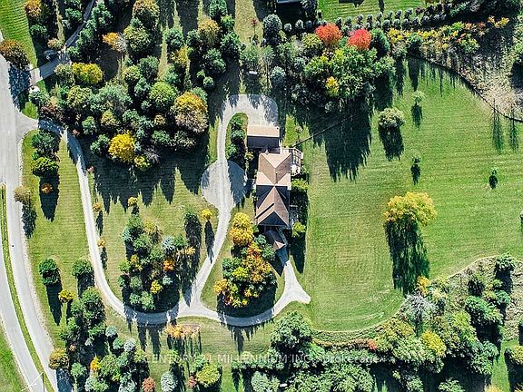 On a prestigious cul de sac, mins outside Alton & Orangeville, is this outstanding custom-designed 3+2 bed, 3.5 bath bungaloft with a finished walk-out bsmt in the French chateau style, with breathtaking views, both north and south, over the Caledon countryside. Sitting stately on the hillside w/ manicured grounds, this home features 4 fireplaces, multiple walkouts, a fenced dog run, a large wraparound deck w/ views of the private rear field w/ apple trees, and a 1+ acre pond. Bright & spacious 2-bed in-law suite has a 1-car attached garage (a rarity!), sep entry & a walk-out to a private patio w/ perennial garden. Extensive architectural qualities include elegant crown mouldings, bump-out niches & faux columns, pocket doors, arched hallways, strategically located pot lights, tray ceilings w/ ribbon lighting & quality materials such as cross-sawn oak floors thru/o. Dramatic Great room w/ soaring 19 ft. cathedral ceiling & stone-clad gas FP and mantle is open to the chefs Kitchen in natural maple wood w/ a large c-island w/ b-bar, granite c-tops, 12 ft. tray ceiling w/ lighting, SS appliances, a desk, wet bar, heated stone floors & a garden door to the deck w/ a gas BBQ hook-up. Primary has walk-in closet, gas FP, 5-piece ensuite w/ a glass shower & soaker tub. Laundry rm off the ensuite. Double French pocket doors on the main level offer privacy to the loft Office w/ a gas fireplace, built-in cabinetry & south-facing views. Lower level Rec rm has a garden door w/o to the b/yard. Rough-in 3-piece bath. Built in 2008, offering approx. 5100 sq.ft. of fin living space, 9 ft. ceilings on the main level, privacy, on 10.85 acres, while being close to Highways 10 and 9 for easy commuting, the hospital & Orangeville for all amenities. Near quaint restaurants, craft breweries, farmers markets, TPC Toronto Golf at Osprey Valley, Millcroft Inn & Spa, Hockley Valley Resort, hiking trails & conservation areas, and the Hill Academy. 45 mins to TO & Pearson Airport.