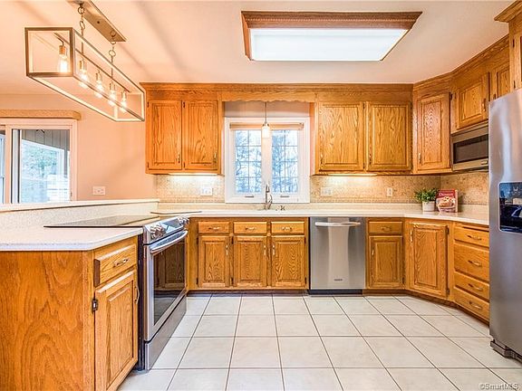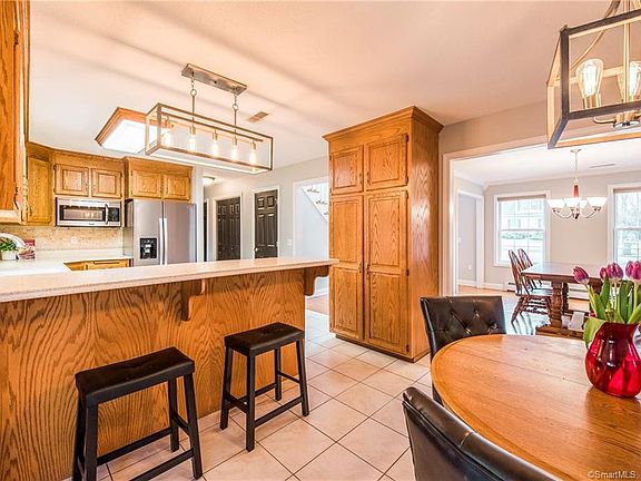 Stunning 4 bedroom colonial freshly painted on beautiful sought after cul-de-sac. Walking distance of the town school and library. Fantastic curb appeal with new craftsman style front door for $8,000. Updated eat in kitchen with breakfast bar, stainless steel appliances and corian counters with trendy tile backsplash. New trendy light fixtures. Sunken living room with vaulted ceilings and Harmon wood stove for $5,000. Formal dining room with crown molding and beautiful hardwood floors. Great office space on the first floor which could also be used as a den or playroom. Convenient first floor laundry in the half bath. Two story foyer and beautiful woodwork up the stairs. Spacious master bedroom with a master bath, granite countertops with a double sink and walk in closet. Central vacuum system. New a/c and heat pump $12,000. New carpeting in bonus room. Beautifully landscaped yard with a large shed, fruit trees, new beautiful pavers $18,000 and fire pit. Beautiful sun room and deck. Wired for hot tub on open part of deck. Concrete poured by Enfield Transit Mix, see attached email and visual inspection done by Mike Dion in 2020.