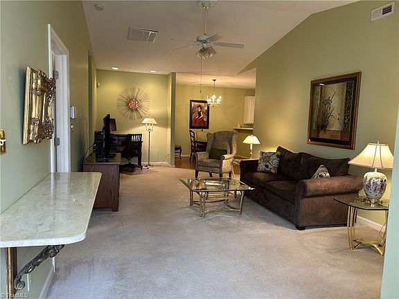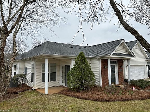 Welcome to this One Level end unit townhouse in impeccable condition and ready to move in. Cathedral ceiling in living room and tray ceiling in primary bedroom. Primary suite has walk-in closet and doulble vanity bath. The 2nd bedroom has a walk-in closet. The 3rd bedroom opens to a private patio. Kitchen with all appliances and bar counter overlooking the dining area. Laundry room with washer/dryer and lots of storage. Two car garage with pull down stairs to attic for more storage. 3 solar tubes bring in lots of lighting throughout home. This home can be purchased FULLY FURNISHED or UNFURNISHED. Maintenance free living close to all shops and restaurants at Guilford College complex. Community pool and club house included in HOA dues.