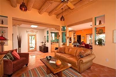Enter through antique doors to an enchanting courtyard - a tranquil oasis with lush landscaping. A living room with high ceiling, vigas and kiva fireplace flows into the open concept dining area & outstanding kitchen with an abundance of tall birch cabinets, slab granite countertops & stainless appliances. The home has a split bedroom layout with a master suite featuring vigas, wardrobe style closets & gorgeous master bath. An attached spacious studio/guest suite with concrete floors, kiva fireplace & private bath has a separate entrance from the courtyard. The main living area and master suite have stunning Spanish floor tile & glass doors leading to the patio. Oversized heated garage has lots of storage & light as well as a utility sink. The home also has ten skylights, ceiling fans and recessed lighting. The lot is among the best in Eldorado, on a cul-de-sac overlooking greenbelt, with exquisite views from the private rear patio. One year American Home Shield Protection Plan offered
