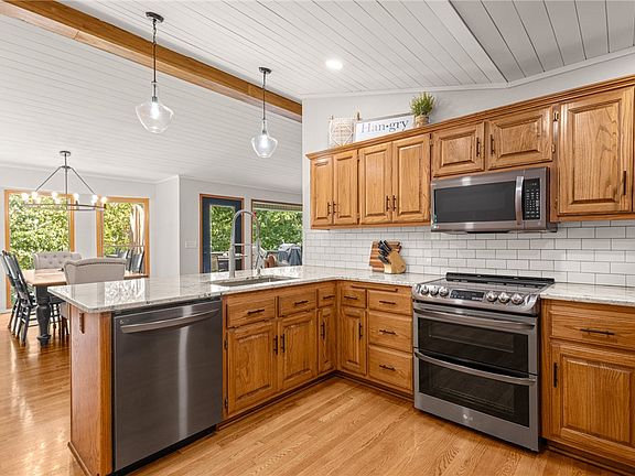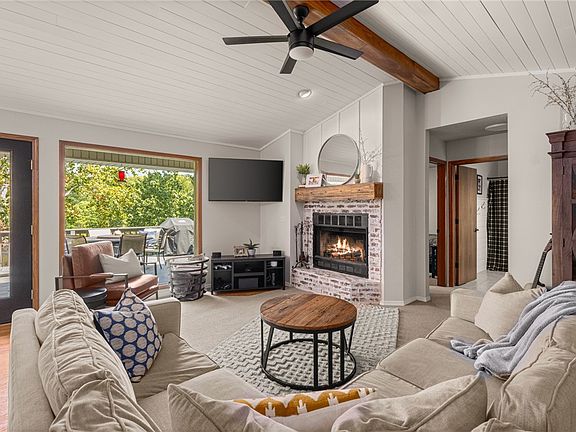 Lake Front Home w/ Private Dock! This 4-bedroom home features a great layout, large circle drive adding privacy & closer to lake, 3 level outdoor living space. Main level has beautiful tongue & groove ship lap ceiling w/ wood beam. Living room has brick wood burning fireplace &stunning lake views. Renovated kitchen w/new appliances & granite counters. Primary bed on main level w/fully remodeled bath w/ large walk-in shower, double vanity & WIC. 2 guest beds & one bath on main. Downstairs is a full second living area w/living space & full kitchen, full bath/laundry. 4th bedroom has attached bath. Flex room for 5th bed/office/game room. Enjoy lakeside setting from the expansive outdoor living area, both covered & uncovered decks & stairs to your private boat/swim dock! Workshop w/crawlspace storage. Easily accessible to Bentonville & I-49. Community amenities include golf, lakes, mountain biking trails & OZ Bike Park, gyms, pools & more! MOTIVATED SELLER – BRING YOUR OFFER!