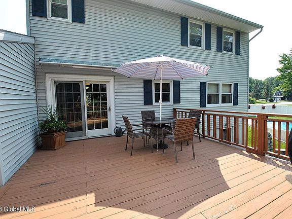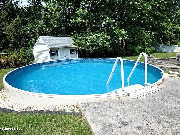 Discover this well maintained, 3 Bedroom, 3 Full Bath COLONIAL situated on an OVERSIZED LOT! Main floor with two SPACIOUS living rms! Formal dining w/chair rail. Eat in kitchen exits to the expansive two tier deck, overlooking the massive backyard! Completely fenced in--ideal running space for pets! Perfect sized, semi-inground, RADIANT pool system-super strong construction! Salt water. Look out from the covered front porch to the gorgeous front yard-nicely landscaped with new Stone. Sizable Bedrooms. Primary Suite with its own full bath. Lots of closet space. Updated 2nd story Bath. Convenient walk out basement to the custom Stone paver patio along with a walkway to the custom SHED. Finished storage areas in basement. Separate laundry & utility rooms. Super convenient Colonie location