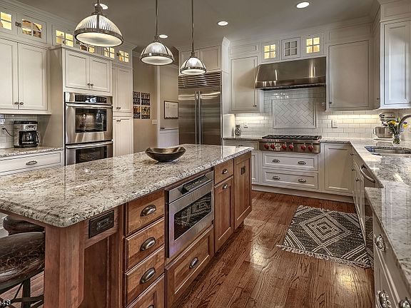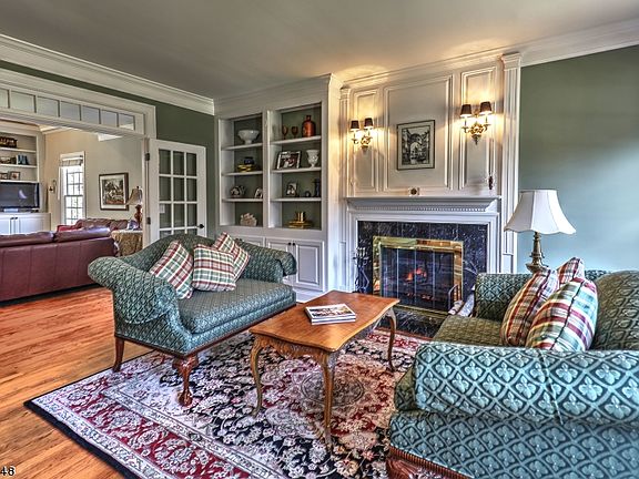 Williamsburg Colonial at Glennon Farm Estates A gracious Williamsburg-style Colonial is sited on 3.71 open and wooded acres in one of Tewksbury's premier neighborhoods, Glennon Farm Estates. The sun-filled floor plan provides four bedrooms, four full and two half baths plus an attached three-car garage. Set far back from a quiet cul de sac street, a long paved drive leads to the circular front entrance. This beautiful home is capped by a traditional cedar shake roof, while its stone front is balanced by clapboard siding. Of special note are the carefully planned grounds, where blooming trees, expansive green lawns and colorful gardens enhance the countryside views. Authentic Colonial touches throughout the home include deep crown moldings, wainscoting, hardwood floors, handsome built-ins and three fireplaces. The point of entry is an elegant two-story foyer featuring a turned staircase and hardwood flooring. Spanning from the foyer are some of the home's principal gathering spaces including a formal living room with hardwood flooring, a gas fireplace, crown moldings and custom built-ins. A formal dining room presents crown moldings, dimensional wainscoting and hardwood floors. Sophisticated and stylish, the chef's kitchen is fitted with white-toned cabinets, a center island, granite countertops, white subway tile backsplash and a collection of high-end stainless steel appliances. In the kitchen's dining area is a convenient wet bar and a set of French doors to the delightful sunroom. Enclosed by three walls of transom-topped windows, this bright, airy sunroom overlooks serene views of the rear grounds. Opening from the kitchen, living room and sunroom is a grandly-scaled family room featuring a stone surround wood-burning fireplace flanked by built-in cabinetry. Additional details include a partial cathedral ceiling, hardwood floors and crown moldings. Completing this part of the home are mud and powder rooms, a home office and a rear staircase. Upstairs, the expansive master suite contains a gas fireplace, walk-in closet fitted with wardrobe organizers, applied ceiling moldings and hardwood floors. The recently renovated master bath offers a clear glass-enclosed shower, soaking tub, double sink vanity, separate makeup vanity, marble floors and a private commode. This level is completed by a guest suite with private bath, two additional bedrooms that share a full bath, a bonus room offering numerous uses and a thoughtfully-located laundry room. A finished walkout lower level is light-filled and accesses the gardens from a French door. This level has a full bath, recreation room, home office adjacent to the full bath, wet bar, temperature-controlled wine cellar, workshop plus storage and utility spaces. Much care and thought was put into the home's landscaping. It features a stream on the lot, stone walls, numerous flowering trees, scores of ornamental shrubs and multi-hued perennials. The picturesque setting can be enjoyed from a roomy rear deck and the rear yard's stone patio warmed by an outdoor fireplace. Tewksbury Township in Hunterdon County is prized for its picturesque scenery, equestrian estates, open spaces and proximity to Interstate 78 for commuters. Residents appreciate a relaxed country lifestyle close to numerous amenities such as shopping, dining, schools, cultural venues and recreational opportunities.