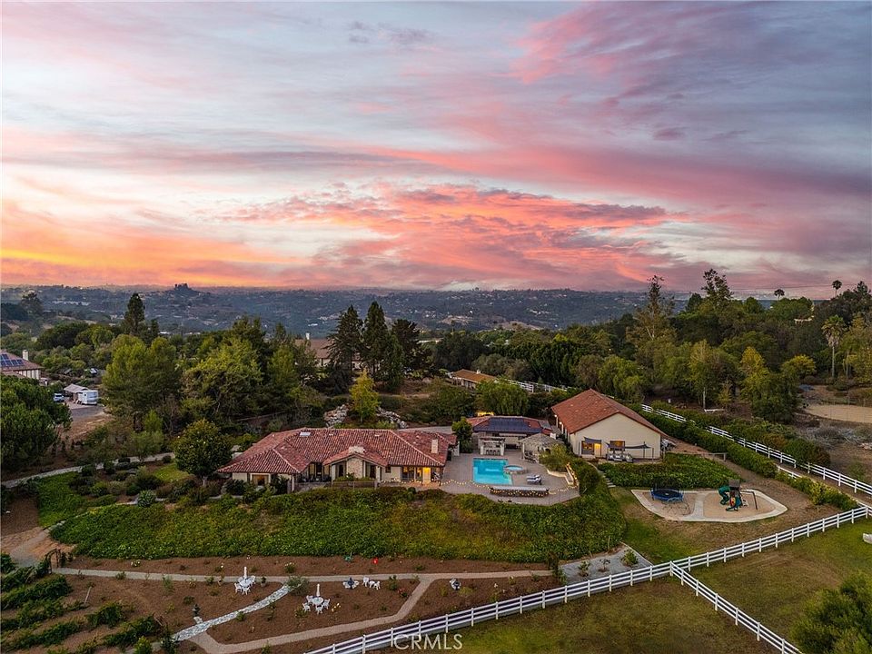 Welcome to 4 Golden Meadow Lane, Fallbrook — a private estate in the prestigious guard-gated community of Rolling Hills Estates, where country charm meets luxury living in an equestrian-friendly setting. This single-story residence, with OWNED SOLAR, sits on a 2.57 acre beautifully landscaped, expansive lot designed for both relaxation and recreation. The main home offers bright, inviting living spaces with thoughtful details throughout. A separate full shop with its own living quarters includes one bedroom and two flex rooms; perfect for guests, extended family, office space, or hobbies. The backyard is an entertainer’s dream — complete with a sparkling pool and spa, a fully equipped outdoor kitchen, and a dedicated pool house for guests or recreational use. Beyond the pool area, the property unfolds into a private vineyard and an assortment of mature fruit trees, creating a picturesque setting and the opportunity to enjoy your own fresh harvests. For equestrian enthusiasts, this property is a rare find — horses are permitted on-site, allowing you to keep your horses at home and enjoy direct access to the neighborhood’s private horse trails. The community also boasts a full equestrian center for boarding, training, and events. Living in Rolling Hills Estates means enjoying a wealth of amenities, including: Guard-gated entry with 24-hour security, Miles of scenic horse and walking trails, Golf cart-friendly streets, Pickleball and tennis courts, Clubhouse for community gatherings, A tranquil pond and lush green spaces, RV parking available for residents. Whether your perfect day includes a morning ride, an afternoon swim, tending your vineyard, or entertaining friends under the stars, this home offers a rare combination of space, lifestyle, and privacy — all in one of Fallbrook’s most sought-after communities.
