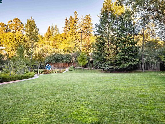 This home will create lasting family memories. The centerpiece is the rarest find in Orinda: a 5400-square-foot (+/-) flat backyard. The lawn is surrounded by mature trees, gardens, a creek and footbridge, paths and sitting areas, spa and pool, outdoor shower, firepit, playhouse and sport court. A patio features a gas grill and basalt counter under a pergola. The home primarily offers single-level living. The main floor’s common areas feature oak floors and lush carpeting. The family room has large windows, a desk area, and a wood-burning fireplace. Adjacent is a dining room with a buffet, a living room featuring beamed ceilings and another fireplace, and mahogany and glass sliders to the gardens. The main floor has 4 bedrooms and 3 full baths. The primary suite features a bath with dual sinks and updated fixtures, 2 spacious walk-in closets, and a vanity. 3 other bedrooms complete the living quarters. The kitchen features a Wolf range, walk-in pantry, 4½ x 12-ft island, and ample cabinetry. Work-from-home is a delight in the bookcase-lined library. Downstairs is a rec/movie room and 1000-bottle wine cellar. The upstairs suite is perfect for an au pair or multigenerational living, with a family/play room, bedroom, full bath, space for a kitchenette, and an external entrance.