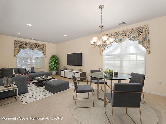 Welcome home to the Four Seasons at Mirage, an exclusive and active adult community that offers the finest amenities for those looking to enjoy life by the Jersey Shore! This lovely Bonaire model is a two-bedroom, two full bathroom, 1868 sq. ft. residence with 10' ceilings throughout. Light and bright, this spacious home is ideal with an open concept living space, designed for comfort and convenience. Enter a tiled foyer entry, with a formal living room and dining room harmoniously blending for stylish entertaining. A beautiful sunlit kitchen with extensive 42'' white cabinetry, plenty of counter space and a separate pantry awaits the gourmet chef, which opens to an inviting and warm family room just steps away. Large windows adorn the walls with a French door leading to the exterior, tree lined patio area, perfect for barbequing on a warm summer night! The primary suite is both generous and private with an oversized walk-in closet and master bath featuring double sinks and shower stall. An additional guest room is also amply proportioned and affords a comfortable second bedroom or optional office space with a hall leading to a full bath. Additional home features include a laundry room, two car garage with Liftmaster door opener, attic storage and recessed lighting throughout. Situated on a quiet cul-de-sac street, in a desirable section of the development, this home is not to be missed! Four Seasons at Mirage is a resort-like community with an impressive 23,000 sq ft clubhouse that has all the bells and whistles! Be pampered with a year-round indoor heated pool, hot tub, saunas, billiard room, fitness center, library, social room and more. The amenities are abundant and outdoor living is luxurious featuring secure, well-maintained grounds, an outdoor swimming pool, tennis courts, bocce, shuffleboard, horseshoes and even a putting green! With proximity to the GSP, shopping, dining, outstanding beaches, LBI and Atlantic City, this 5-star community provides the ultimate in maintenance free living, exactly what you have been waiting for!
