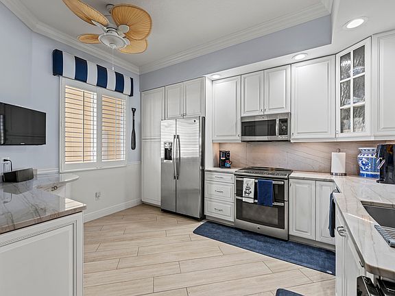 Stunning viewNewer appliancesQuartz countertopsFlorida roomCeiling fansPorcelain plank floorsPlantation shutters