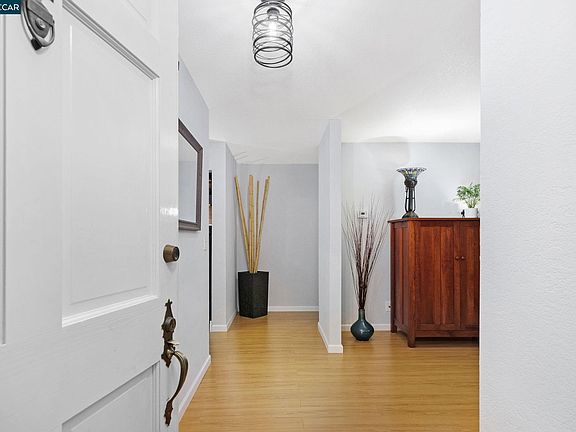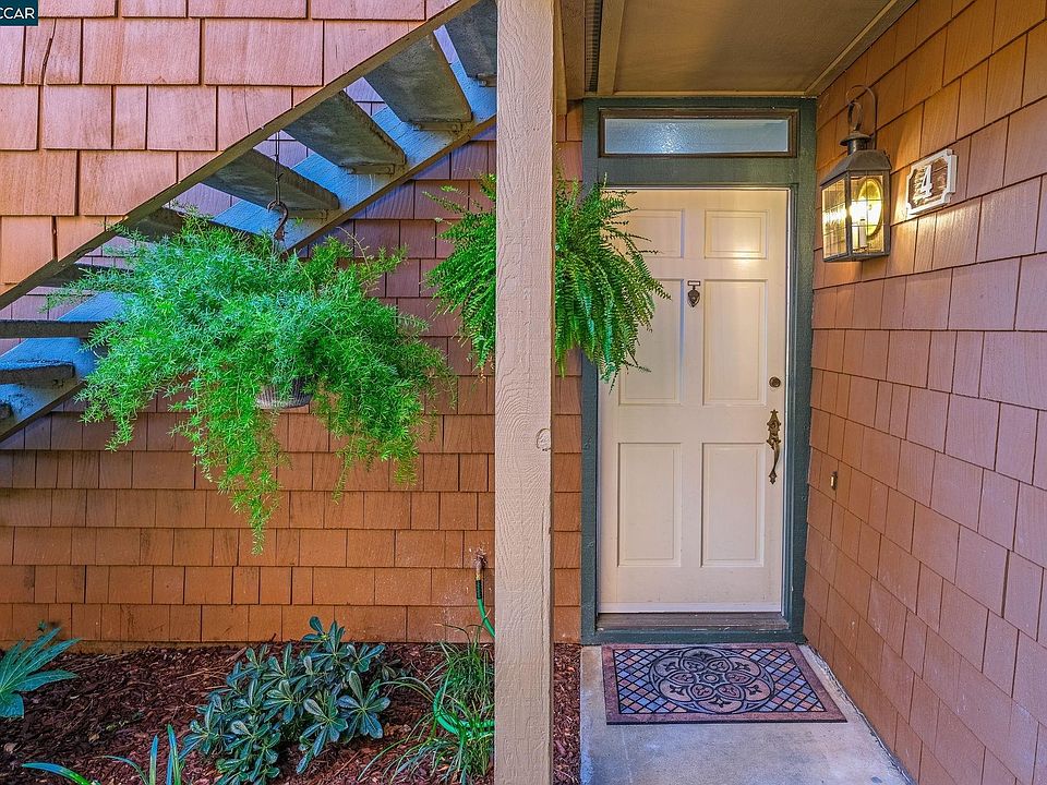 Cobblestone Court complex two bedroom, two bathroom condo featuring laminate flooring and serene deck. Lush landscaping surrounds the tucked away entrance before entering in the open floorplan including beautifully updated kitchen with Quartz counter tops, wood Shaker-style cabinets, stacked subway tile backsplash and Samsung appliances. The dining area is perfect for entertaining with a built-in sideboard complete with 50-bottle wine fridge. Living room features a wood burning fireplace and large glass sliding door with oversized windows allowing access to the deck and awash of natural light. The spacious primary suite boasts a large walk-in closet with modern barn doors and en-suite bathroom updated vanity and large-scale tiled shower. Additional bedroom offers ample closet space and flexible set up for home gym, office or guest quarters. Hall bath features modern vanity and stall shower. Additional amenities include single car detached garage and additional assigned carport parking, convenient location close to shops/restaurants, 680 and 24.