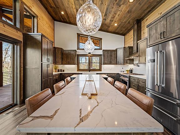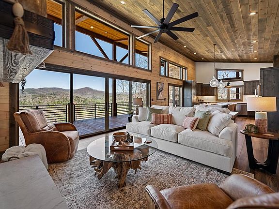 Spectacular SUNSET YEAR ROUND MOUNTAIN Views! FURNISHINGS INCLUDED 4br/3.5ba Impressive Mountain Modern Complete New Construction. No detail overlooked in this thoughtful floor plan! Perfect mix of modern & rustic elements with low maintenance exterior! Main floor covered entrance with rock accents, an open concept with great room boasting a linear stone fireplace, soaring cathedral ceilings, wall of windows, massive sliding glass doors, ample dining space, spacious kitchen with high end appliances, gas range, granite counter tops, large island with tons of seating & custom cabinets, master suite with walk in closet, custom tile shower, double vanity, half bath, & true laundry room. Expansive windows all across the front to bring the views inside. Covered wrap around back porch spanning length of home with exterior fireplace & outdoor kitchen. Lower level provides the perfect space to entertain with game room, 2nd fireplace, wet bar, 3 guest bedrooms and 2 full baths, walk in closets + 2nd level of covered porches opening out to level usable back yard perfect for a fire pit & possible location for a pool. Covered storage area to side of house would be great for storing ATVs with access from driveway. Perfect location in gated community nestled adjacent to the Cohutta Wilderness area with tons of outdoor recreation/hiking/horse back riding/fishing. Just minutes to Downtown Blue Ridge and Lake Blue Ridge. Would make a great short term rental!