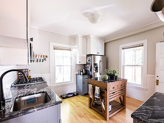 This charming and updated 2 bedroom apartment is situated about a quarter mile from the Newtonville commuter rail with shops and restaurants right around the corner. The first floor of a two family, with a small common backyard, this unit boasts original details like decorative mantles and hardwood floors, but has modern amenities like closet space and central air. The kitchen is beautifully updated with Bosch appliances, granite countertops, a custom built in island and a walkthrough pantry offering tons of storage. A bright and spacious living room, generously sized master bedroom, and modern dining room make this unit truly special. There is private laundry and large storage area one floor down in the basement, and the unit includes 2 tandem off-street parking spots. Available September 1st. Please view the video tour!