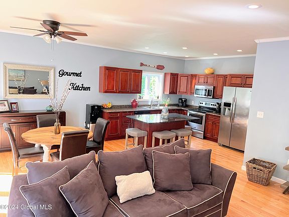 Nothing to do but move in! Walk to the town beach or sit by fire pit! Low taxes! Public water & sewer. Averill Park School Dist. Located on dead-end street w/privacy. Features open floor living with gas fireplace, central air, recessed lights, ceiling fans, crown molding, gleaming hardwood floors, and granite kitchen island with stainless appliances. Lg. bedrooms. Master suite with whirlpool tub & walk in closet. Huge, finished basement w/egress window, sauna & pool table for the ultimate rec room. Plenty of storage w/oversized 2 car garage. Dining rm slider overlooks woods. Outside boasts a private deck with seasonal views of Snyder's Lake, a patio and fire pit, apple trees, raised bed gardens & greenhouse. Great location - short commute to Albany & Troy, Regeneron & RPI Tech Park.