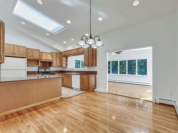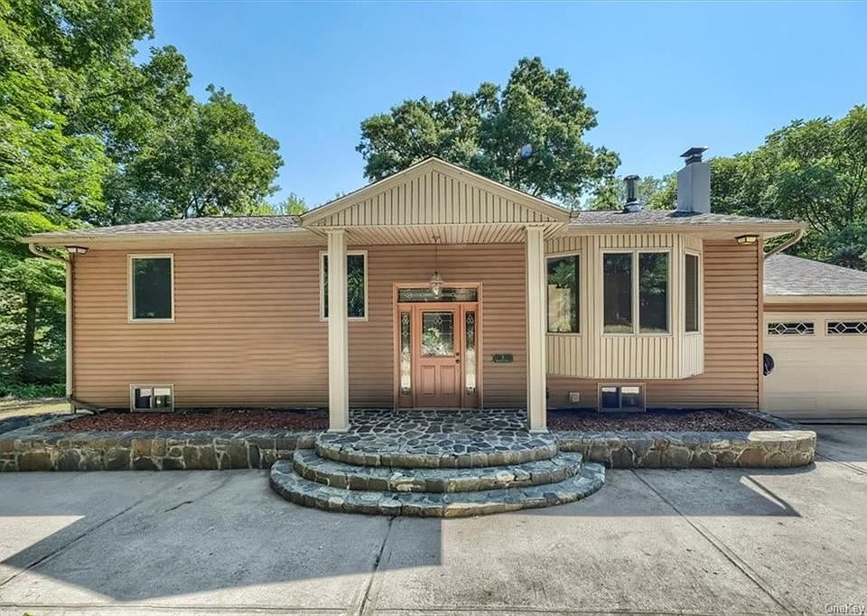 The beautifully updated & well maintained spacious sun filled contemporary ranch style home is set on a private wooded acre lot. Main level features oversized living room with custom windows, formal dining room, updated kitchen with cathedral ceiling, skylight & granite countertops, & family room with cathedral ceiling, skylights & door to multi level decks. Master bedroom with half bath, two large bedrooms & full bathroom. Hardwood floors on main level. Finished lower level features family room, recreation room with door to covered deck, den or office with side door to yard, full bathroom, utilities & laundry. Attached one car garage & large driveway for parking several cars. Maintenance free vinyl exterior, front patio, lower level & upper level decks, stone walls & steps, & stone BBQ accent the exterior of this home. Private setting surrounded by mature trees & landscaped yard with gardens. A lovingly updated & maintained home with great space for both inside & outdoor living.
