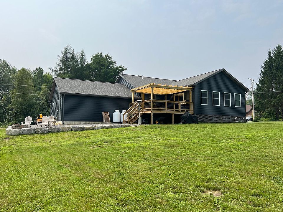 Welcome to this exquisite newly constructed custom built ranch home, boasting timeless elegance and modern comforts. This stunning home is just one year old and is nestled on an oversized and beautifully landscaped 4.73 acre corner lot, offering a serene and private retreat. As you step inside, you'll be greeted by the impeccable craftsmanship and attention to detail that went into every aspect of this home. The spacious layout encompasses three bedrooms and two full baths, providing ample space for relaxation and privacy. The attached two-car garage ensures convenience and easy access to your vehicles. The heart of this home is its amazing kitchen, equipped with top-of-the-line stainless steel appliances that will delight any culinary enthusiast. The stainless farmer's sink and granite counters add a touch of sophistication, while the large island and pantry cabinet offer plenty of storage and preparation space. Indulge in luxury as you step into the bathrooms, featuring heated tile floors that provide a cozy and comfortable ambiance. The master suite is a true oasis, complete with its own private bath. The large living room boasts cathedral ceilings, creating an airy and open atmosphere. Sliding doors lead to a spacious deck, adorned with a pergola sunshade, where you can enjoy panoramic views of the expansive backyard. It's the perfect setting for entertaining guests or simply enjoying a quiet evening outdoors. This property also features a vegetable garden spot, complete with water access, allowing you to cultivate your own fresh produce. Additionally, a mudroom area provides a convenient space to kick off your shoes and keep your home organized. For those who love gathering around a cozy fire, an inviting firepit awaits you outside, where you can create lasting memories with friends and family. Don't miss the opportunity to make this remarkable home yours, combining luxury, comfort, and the beauty of nature. Schedule a viewing today!