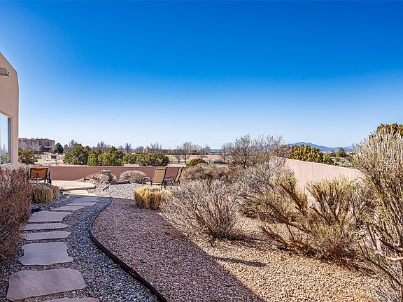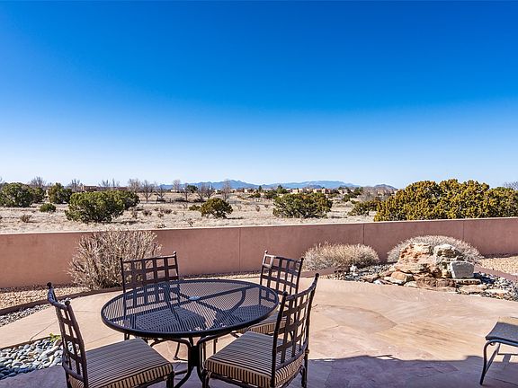 Welcome to your slice of paradise in the highly sought-after community of Rancho Viejo. This exquisite single-level residence boasts unparalleled views of the Ortiz and Sandia Mountain Ranges, offering a lifestyle of comfort and serenity. Upon entering, you'll be greeted by an abundance of natural light that illuminates the entire home, highlighting its spacious and airy ambiance. The thoughtfully designed split bedroom floor plan ensures privacy, with the primary suite tucked away for ultimate tranquility. Pamper yourself in the spacious walk-in closet and indulge in the well-appointed ensuite bath featuring dual sinks, a garden soaking tub, separate shower, and a private enclosed water closet. The heart of the home lies in the inviting living room, where captivating views beckon through large windows. Cozy up by the gas kiva fireplace during colder seasons, adding warmth and charm to your gatherings. Adjacent to the living room, the upgraded kitchen boasts ample storage, upgraded cabinets, and a convenient breakfast nook, making it a perfect spot for casual dining or entertaining. Discover endless possibilities in the additional flex space, separated by a pony wall, ideal for an office, media room, or formal dining area—tailored to suit your specific needs. Two guest bedrooms and a full bath complete the open floor plan, providing comfort and convenience for family and guests. Step outside to your private oasis—a premium, expansive lot enclosed by fantastic native landscaping. Entertain with ease on the flagstone patio, shaded by a mechanical awning, or relax to the tranquil sounds of the rock fountain. The backyard offers the perfect backdrop for outdoor enjoyment and al fresco dining, surrounded by breathtaking mountain vistas. Nestled within the desirable Rancho Viejo community, residents enjoy over 15 miles of paved walking trails, abundant parks, and a vibrant neighborhood atmosphere. With its superlative mountain views and unmatched amenities, this home is truly a rare find—a must-see to fully appreciate its beauty and charm.