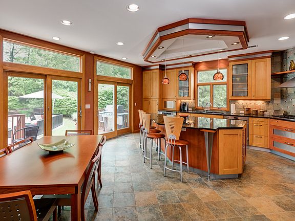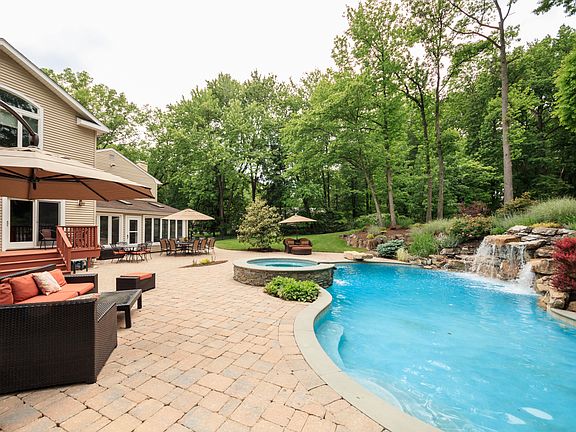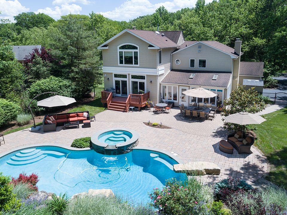 Spectacular grounds surround this equally spectacular custom home on a private street located just minutes from downtown Westfield. Numerous modern upgraded amenities include "show-stopper" custom designer eat-in Kitchen featuring high end appliances, exquisite materials and a striking angled partition wall revealing a fully equipped Butler's Pantry. Great flow for year-round entertaining! Large rooms include formal Living Room with hardwood floors, Dining Room with trompe l'oeil ceiling, Family Room with fireplace and Sun Room with skylight and backyard access. Spacious Master Suite with luxurious updated bath and spacious Sitting Room overlooks breathtaking backyard oasis highlighted by expansive brick paver patio surrounding free form pool with waterfall and jetted spa pool. Almost an acre of flat lawns and fenced in play space await. Don't miss this striking, move-in ready resort-like property!