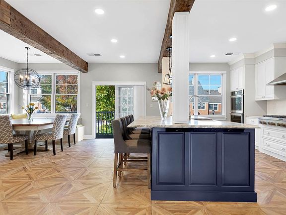 Residence 4 on Intrepid Court is a distinctively updated 2600 SF three bedroom, two-and-a-half bathroom townhouse with parking for two cars, on-site NY Waterway Ferry terminal with service to lower Manhattan, and shuttle to the Grove Street PATH Station which services both 33rd Street and Brookfield Place. The thoughtfully designed chef's kitchen features custom maple cabinetry, marble countertops, ceramic tile backsplash, 48-inch counter depth refrigerator/freezer, six-burner gas range with direct vented hood, double oven and garbage disposal. This open concept redesign offers island seating for four, a separate oversized dining space, built in home office and sliding glass doors leading to a balcony. Custom barn doors provide optional separation between the social, entertaining and dining spaces. The elegant dining room shares a dual-sided gas fireplace with the sun-filled living room. The social level of the home is complete with bay window seating, powder room and under the stairs storage. The personal level features an expansive master suite with separate lounge area, custom walk-in-closet, en-suite bathroom complete with double vanity, soaking tub and frameless glass shower. The generous second bedroom includes a walk-in closet and the spacious sun filled third bedroom offers NYC and water views. This stunning home is further enhanced by in-residence laundry, central vac, and oversized backyard designed to fit all of your entertaining needs. Port Liberte is an amenity-rich waterfront condominium community situated between Liberty National Golf Club and the Hudson River. Community amenities include two pools, tennis courts, basketball court, and a 4,600 SF fitness center with saunas, locker rooms and massage room, as well as a playground, community clubhouse and dog park. Monthly maintenance fee includes 24-hour gated security, daily trash removal, snow removal, professional landscaping services and use of all Port Liberte amenities.