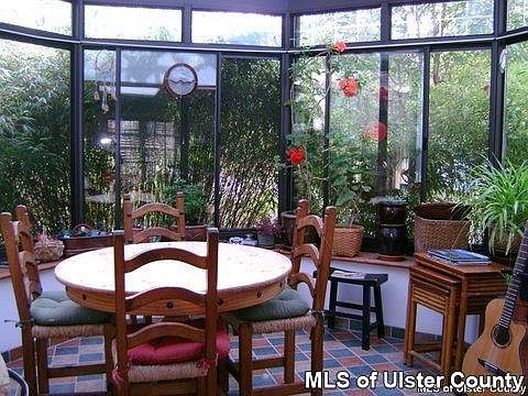 Save on your utility bills in this not so ordinary split-level home! This light-filled home, w/ its amazing atrium/sunroom dining, is perfect for morning coffee or nighttime star gazing boasts an eclectic mix of innovative & inspiring features. Has solar panels & a high-efficiency hybrid electric H2O heater. The studio, with its own separate entrance, currently used as a massage therapy office, with a waiting area, sky-lit main room with woodstove, full bath, & large pantry with fridge. Perfect for airbnb or guest quarters. Plenty of skylights and Solatube "sun tunnels," create a natural ambient light the current owners were striving for. The living room has French doors leading to a grape-arbored patio with a Snorkel hot tub. The eat-in kitchen has a sweet hand-painted tile backsplash, and the large but cozy family room has a wall of bookshelves, a separate office, bathroom, and woodstove to relax and read by. The lovingly cared-for garden boasts apple, pear, peach, cherry, and plum trees, and the fenced-in organic garden has a variety of berries. Truly a very unique property with a Woodstock address and Hurley taxes. Near Trailways bus route.