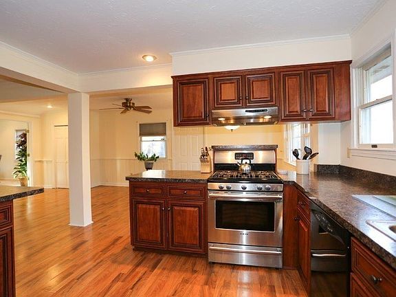 Expanded, professionally landscaped Pelham Cape on a side street in a great neighborhood setting. Nearby is the West Natick commuter rail stop and the Brown Elementary and Kennedy Middle schools. There is a covered porch leading to the spacious, open floor plan with updated kitchen with stainless appliances (all appliances included) and gas cooking. The living room features an exposed brick fireplace, and the family room addition has sliders to the very private patio. The first floor bedroom has a walk-in closet and new laminate floor and could be used as a master. There is a full bath and laundry room on this level. Upstairs is the huge master with private bath with glass shower and two additional bedrooms. Convenient to Routes 9, 135, the Mass Pike and the Natick Mall.