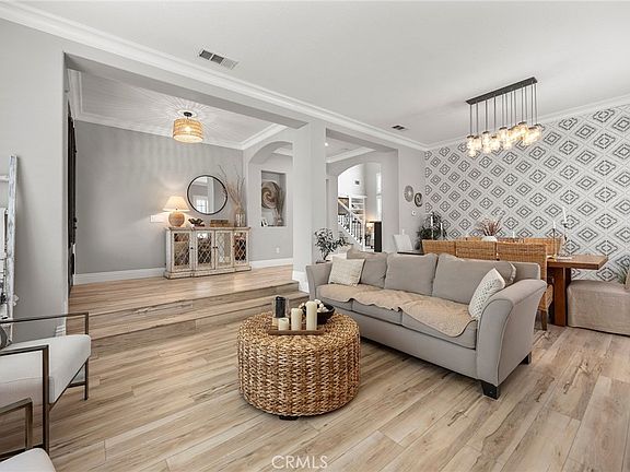 A rare opportunity in the privately gated neighborhood of Stonecliffe. This beautifully remodeled 5-bedroom, 3-bathroom home offers approx. 3,195 sqft of luxurious living space on a sprawling appx 17,594 sqft w over $500,000 in custom upgrades inside and out. Enter your oasis through custom iron double front door and be greeted by spacious sunken living and dining rooms with custom light fixtures and a designer accent wall, crown molding, luxury flooring, wood shutters & cased windows. The gourmet kitchen showcases a GE stainless Café cooktop, GE double oven and microwave, stainless dishwasher and refrigerator, quartz counters and backsplash, custom cabinetry and center island, an extended island with bar seating, a farmhouse sink, and a charming breakfast nook with bay window and built-in bench. The spacious family room has volume ceilings, many cased windows for natural light, custom cabinetry and crafted stone and wood mantel. Hallway off the family room leads to large office/ bedroom w built-in’s ceiling fan and crown molding. Separate bathroom with custom vanity and shower.Large inside laundry with cabinets and convenient folding table. Custom wrought iron and wood stair rails. Luxurious primary suite with volume ceilings and crown molding. Spa like primary bath with custom tub and shower, custom dual vanities with stone counters. Huge walk-in closet with CA closet built-ins. Custom loft with built-ins w a stone top. Large secondary bedrooms w crown molding, mirrored wardrobe doors and built-in closet organizers. Truly one-of-a-kind entertainers backyard w an 18x18 pergola with 8-inch beams and AV hookups sits on a circular paver foundation, surrounded by split-level entertainment zones, patterned pavers throughout, oversized side yards, a custom 120sf finished cottage, a built-in BBQ island with stainless Bull grill and ice chest, 2 cozy fire pits, lighted half basketball court, turf play area, custom brick fencing, matching storage shed and a beautiful view of rolling hills. Additional highlights include paid for solar system, 2 large storage sheds on either side of the home.Upgraded Heritage garage door, epoxy garage floors, garage cabinetry, low-maintenance turf and rock landscaping, and window canopies on upper rear-facing rooms. Enjoy easy access to the gated HOA pool and spa,award-winning schools, hiking trails, Thomas F Riley Wilderness Park, and the 241 toll road — all within this exclusive, gated community.