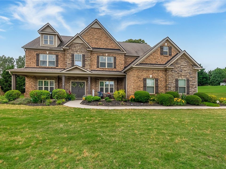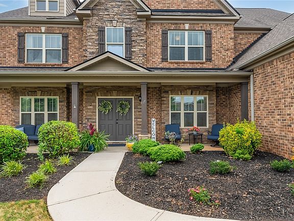 Charming gables of stone and brick blend seamlessly with dark wooden shutters on this 5 bedroom, 4.5 bathroom home in the highly desirable community of Airy Springs. Imagine driving along the tree lined sidewalks to your new neighborhood where you'll enjoy the community pool, fishing pond, and natural beauty of the area while being a short 20 minute drive to the downtown amenities of Greenville. Impeccably landscaped boxwoods and shrubs adorn the front sidewalk to the elongated front sitting porch, where double doors framed by sand colored stones will welcome guests and visitors. Once inside, you'll find an entryway with a cathedral ceiling, hardwood flooring, and elegant wall molding. Expansive arched door frames flank this space on either side, leading to the formal dining room or a plush carpeted office space. The main center of the home is the perfect combination of an open floor plan concept and respective designated areas for dining, entertaining and relaxing. The great room features a floor-to-ceiling gas stone fireplace with mantle, custom built-in bookshelves with storage, and ample space for seating. Two white pillars with trim create an elegant separation from this space to the dining nook and kitchen. The kitchen will delight any gourmet chef with built-in double wall Frigidaire ovens, a gas cooktop, built-in Frigidaire microwave, deep sink with disposal, stainless steel dishwasher, Frigidaire refrigerator with icemaker, island with bar, granite countertops, a walk-in pantry, and a surplus of cabinetry. An additional granite countertop lines the narrow butler's hallway from the kitchen to the formal dining room, providing space for additional food prep or storage. Host a variety of events between the separate and elegant formal dining room with apron ceiling, casual dining at the barstools in the kitchen, breakfast/lunch table adjacent to the kitchen or even outside on the covered patio in your backyard. A guest bedroom (with its own full bath) is also located on this main level, providing comfort and privacy for visitors. The stairs to the upper floor lead to an open-air landing platform with a balcony view of the front door and three additional guest bedrooms, two of which share a jack-and-jill bathroom. The second floor also has a spacious media/living room and impressive master suite. This luxurious main bedroom suite has lots of natural light and space. It opens to its own private sitting parlour with a gas fireplace. A true oasis separated from the rest of the home, this suite connects to a private spa-like bathroom with dual vanities, a separate soaking tub framed by a large window, walk-in shower, individual water closet with door and toilet, and a sweeping oversized master closet. For extreme convenience, a door from the master suite leads to the tiled laundry room. No need to carry laundry up and down the stairs! The home sits on a level .55 acre lot with a wide driveway that curves to the side of the house. Protect your cars from the South Carolina sun in the capacious 3-car garage. Enjoy the shade created by both your built-in covered backyard patio and the tall trees that line the back perimeter of the yard - a perfect spot for grilling and outdoor entertaining. Priced competitively to sell, our brokerage's last listing in this neighborhood was under contract in less than a week! Don't miss your chance so see this captivating home in a great location!