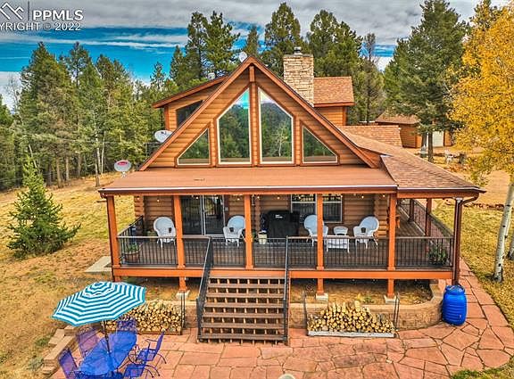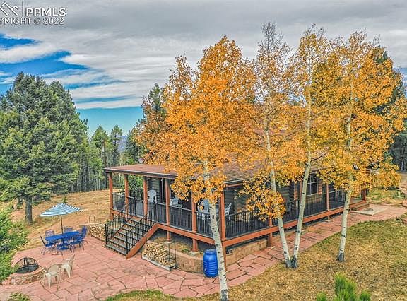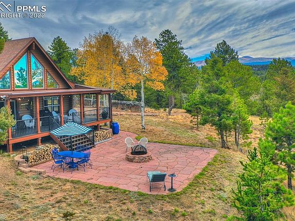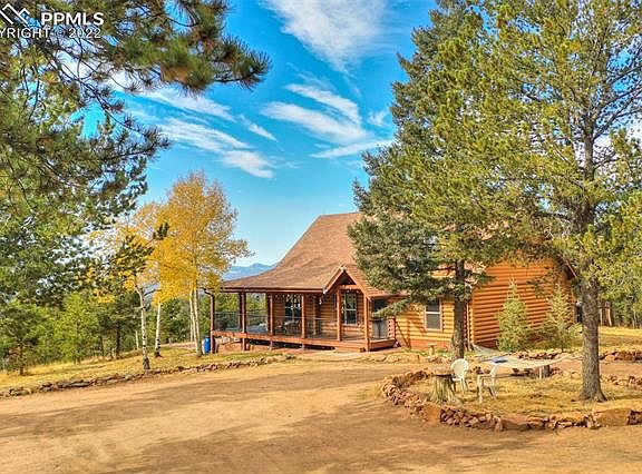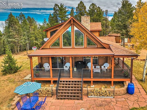 A spectacular mountain, log home located on 35 acres, which adjoins Mueller State Park, for an extra 5000+ acres of recreational access! The property is nestled in a mix of aspens, pines, firs, and spruce trees, and even includes a year round spring that feeds a small pond, enticing wildlife to visit the pond regularly. The log construction is an 8 inch round cut log, notch set construction, for easy care and maintenance with "no chinking". Grand, soaring tongue and groove ceilings in the great room, with an overlooking loft above. Centrally located custom mason fireplace with a free-standing wood-burning stove, allows this home to be comfortably heated during the wintery chilly months! The floor plan allows for 2 main level bedrooms with a main bath, and laundry room, while the upper level owners suite includes a lofted office, seating area, vaulted master bedroom with adjoining bath, and double closets. Comfortably designed, and meticulously cared for. Some additional features include a single bay garage, log sided, finished and insulated. Also a small barn for animals with an attached corral onsite, in addition, 2 storage containers are included. The land allows for 2 homesites per the County regulations, just in case you want a secondary homesite for family members! Current well will support only 1 residence, with an attached 2000 gallon cistern for extra storage. Come and take a peek at what Colorado Mountain living is all about!!