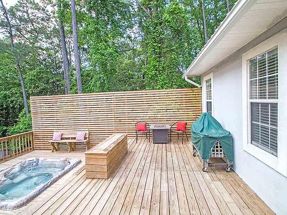 This updated home is tucked away on a cul-de-sac and sits on a huge fenced over 1.5 acre lot. With a new expansive 2 tier deck, plus over sized 8 person 2017 hot tub overlooking wooded back yard. Under the deck is a great shelter, even has metal roof great space currently used for pets. Walk out your back gate and enjoy nature with 15 acres of woods and trails owned by the City of Spanish Fort. This house has been updated from top to bottom, so many improvements in the past few years. Starting with hardwood floors throughout, no carpet, newer metal roof and AC, plus brand new water heater and plumbing. With entertaining in mind, the kitchen was renovated with open concept 6 top bar, perfectly designed for gatherings. Walk in pantry, farm style sink, granite counter tops, stainless appliances plus built in desk space. Bonus room above garage makes great play room, office or work out space. Split floor plan with over sized master suite on one side and 3 bedrooms on the other plus separate dining room. Need storage? You will love the walk in unfinished basement area, offers tons of storage space. This property is one of a kind in well established Spanish Fort Estates. Located just two minutes to the causeway for an easy commute to Mobile, plus your choice of multiple seafood restaurants!